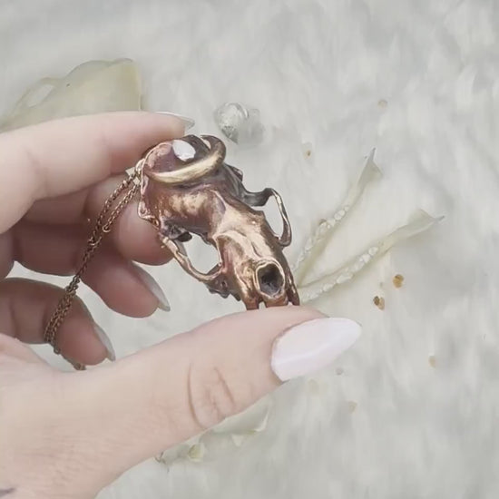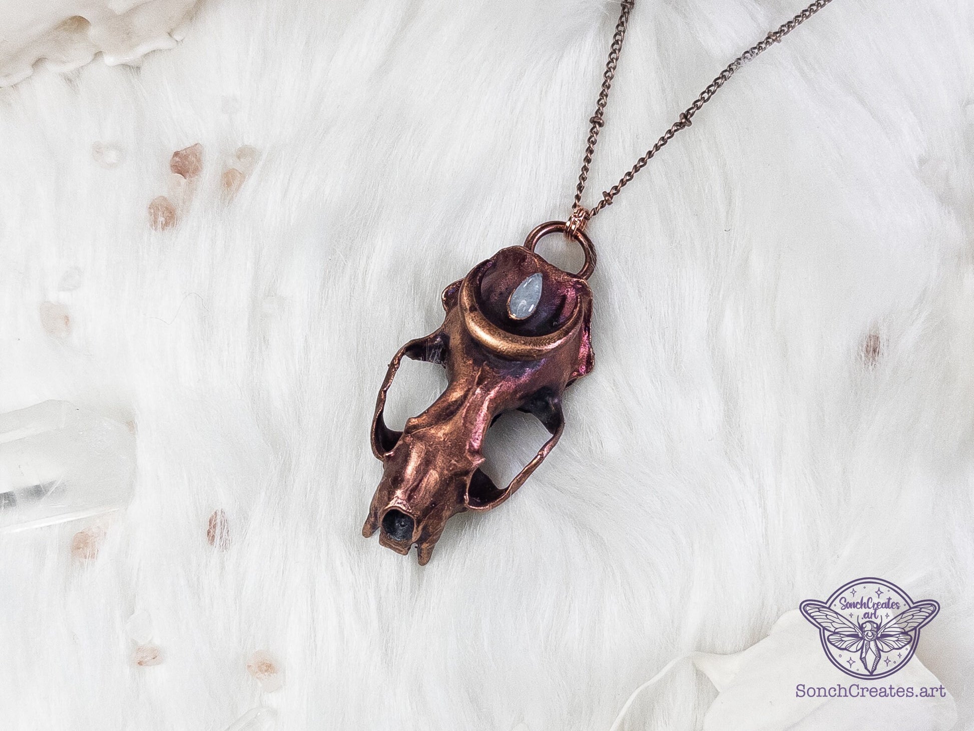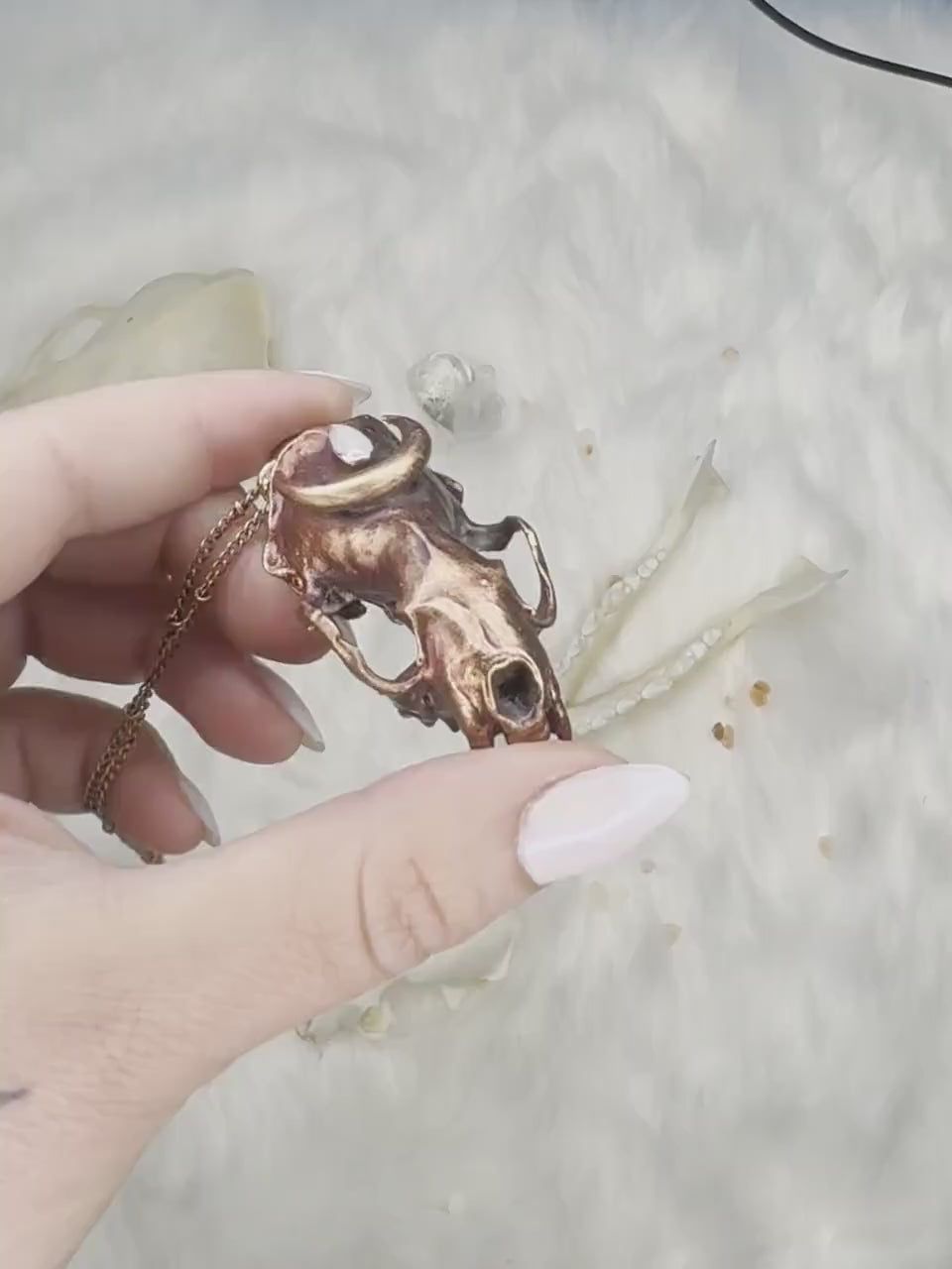 Spooky yet beautiful perfectly describes this magical electroformed mink skull with a celestial motifs - decorated with small white moonstone and moon crescent š¤ This pendant features electroformed copper mink skull - decorated with moonstone . Whole piece is finished with wine-red patina āØ