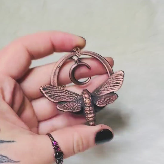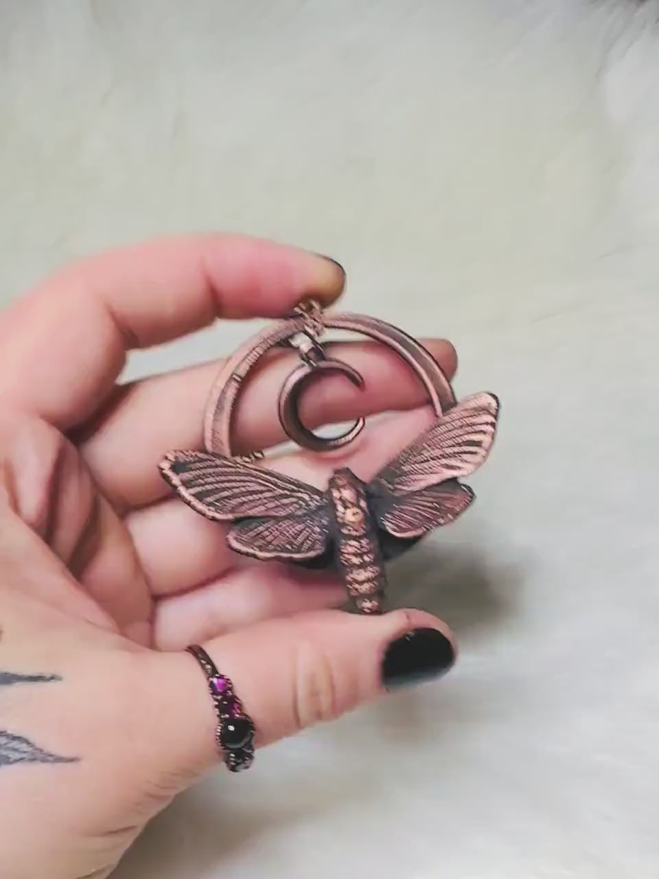 Celestial Moth decorated with dangle moon charm. created via the copper elctroforming technique and finished with Brown vintage patina š.