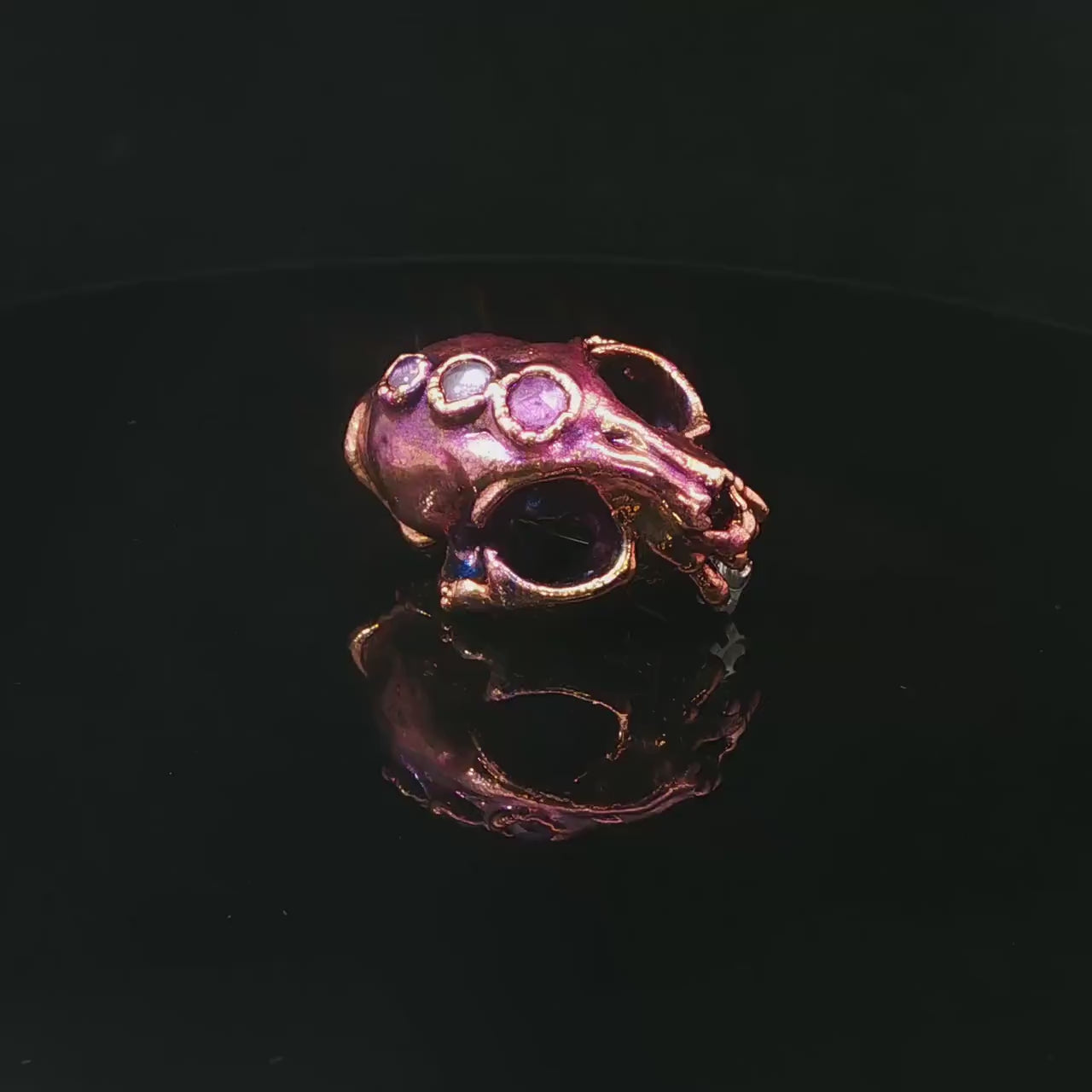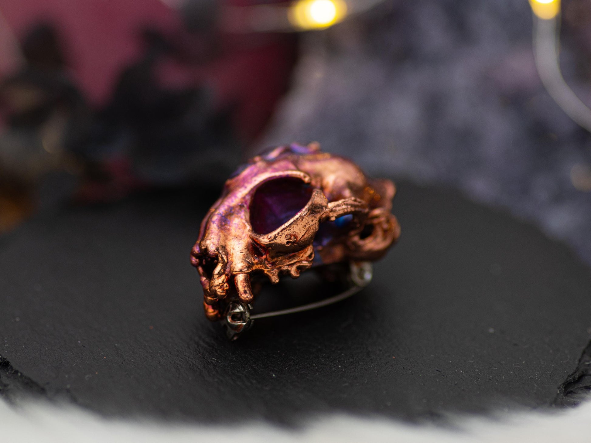 Cat Skull -decorated with three, gorgeous, hand faceted amethysts. This cat skull brooch is a 3D-printed replica created from a high-resolution scan of a real cat skull. Each piece is hand-finished: the details are refined with rotary and engraving tools, and all surfaces are carefully sanded to achieve a realistic, anatomically accurate look. All put together via the copper elctroforming technique and finished with dark vintage patina 🌙.